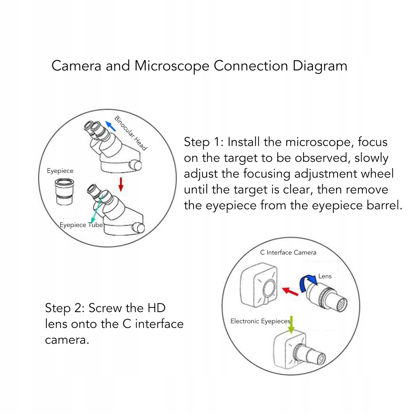 2. Просте підключення: верхню частину можна підключити до комп’ютера або монітора через USB, нижню частину можна вставити безпосередньо в мікроскоп або телескоп діаметром 23,2 мм, адаптери 30 мм і 30,5 мм входять в комплект.
