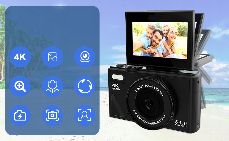 - Ця цифрова камера 4K пропонує багато функцій, як-от Панель DIY, подвійні камери, режим серійної зйомки, стабілізація зображення та функція захоплення обличчя. Функція призупинення запису відео допомагає заощадити час і пам’ять, а функції сповільненої зйомки та сповільненої зйомки дозволяють реалізувати власні ідеї.