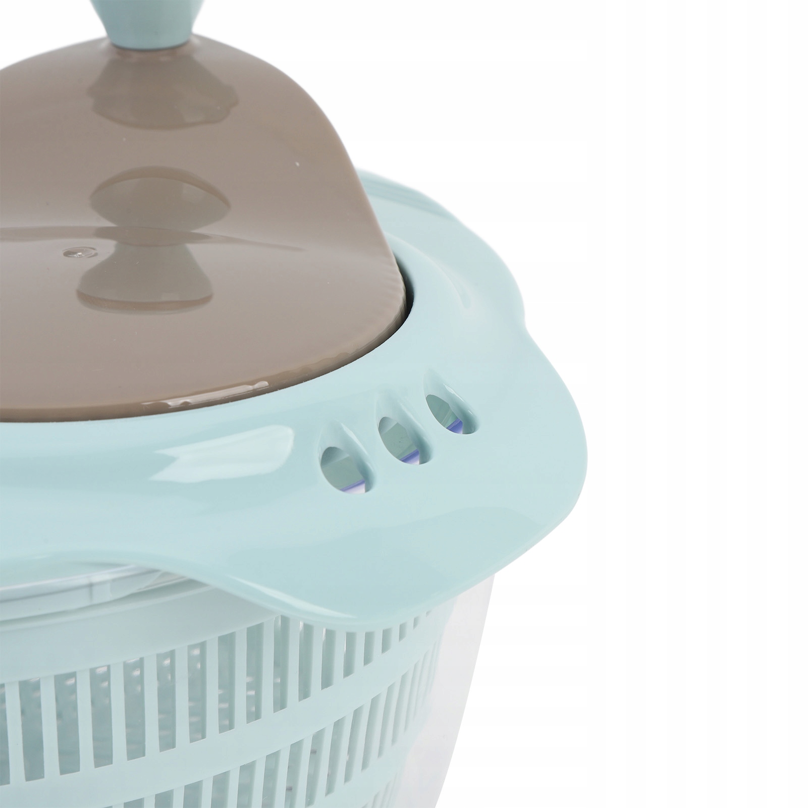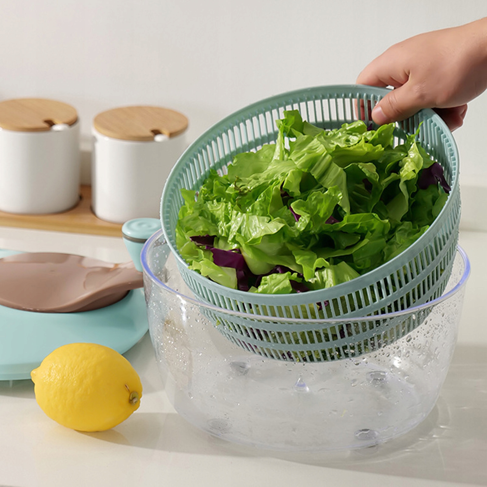1. Подвійне розділення шарів: Сушарка для салату — це конструкція подвійного розділення, яка постійно тримає ваші руки подалі від води. Ця продумана техніка гарантує, що ви можете підтримувати чистоту та гігієну під час роботи з фруктами та овочами.