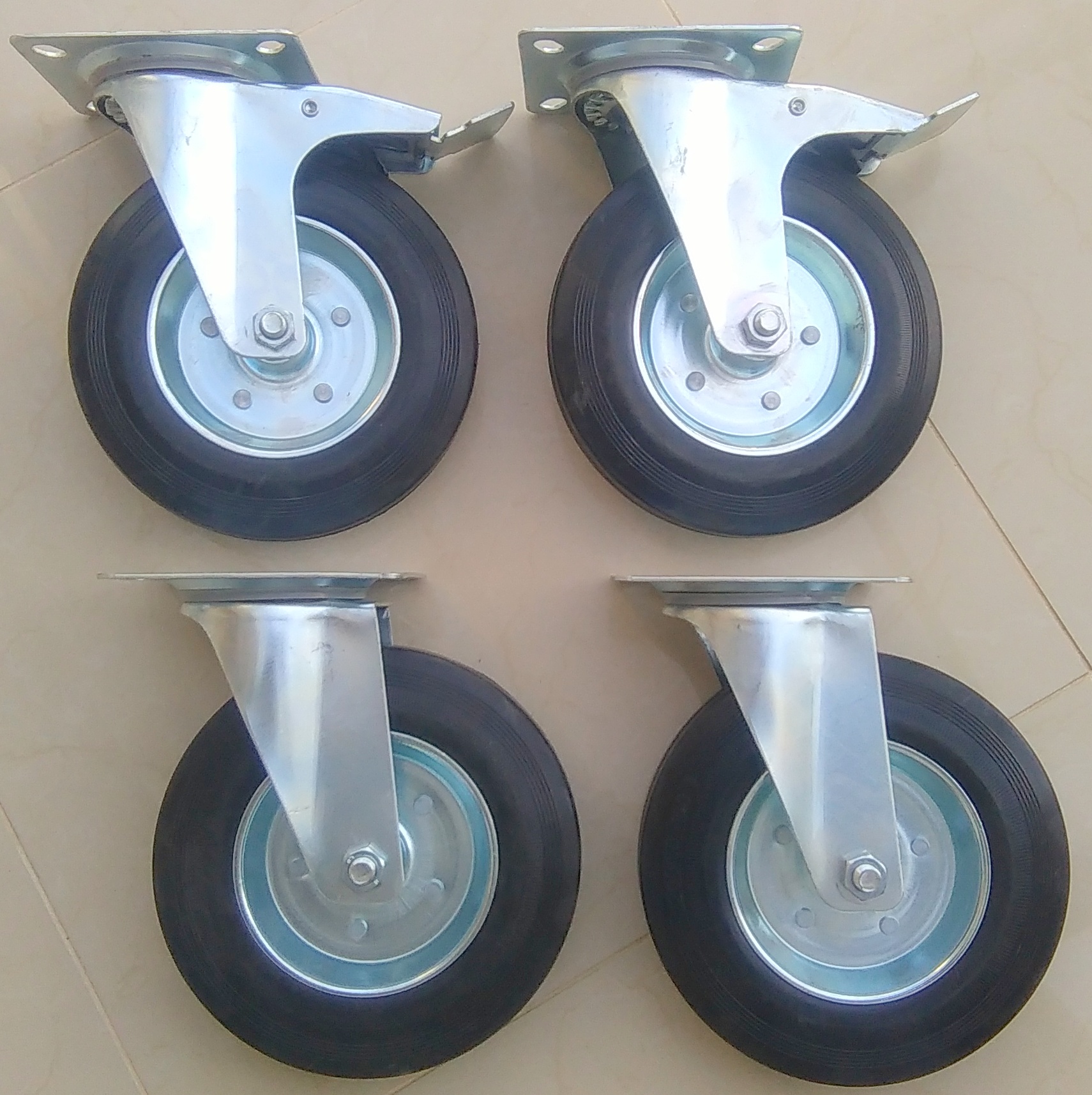 Колеса встановлені на т.зв Пластина являє собою комбінацію вилки з пресованого сталевого листа і колеса зі сталевою втулкою і шиною з суцільної чорної гуми. Поворотна головка вилки має подвійні підшипники та захищена від бруду спеціальним пиловим ущільнювачем. Всі металеві елементи комплекту покриті антикорозійним хромоцинковим покриттям. Гальмо блокує колесо та голову.