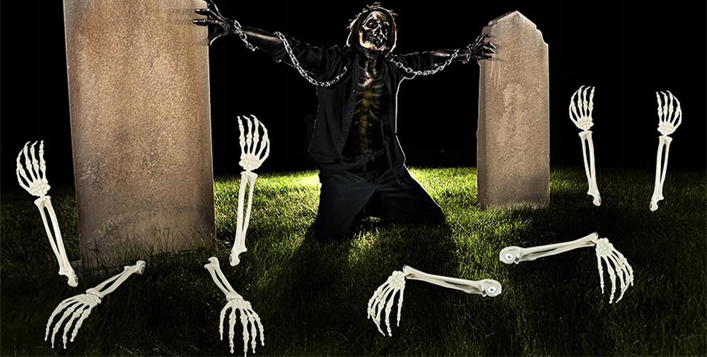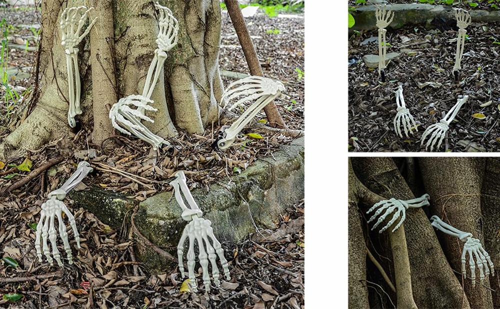 - 🎃 Просто покладіть руки скелета на галявину, і вони будуть виглядати як примарний дух, що виникає з могили! Вони ідеально підходять для Хеллоуїна, прикрас кладовищ та прикрас зомбі всередині та зовні. Вони, безумовно, лякають ваших друзів та сусідів.