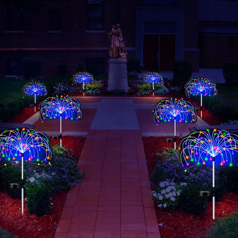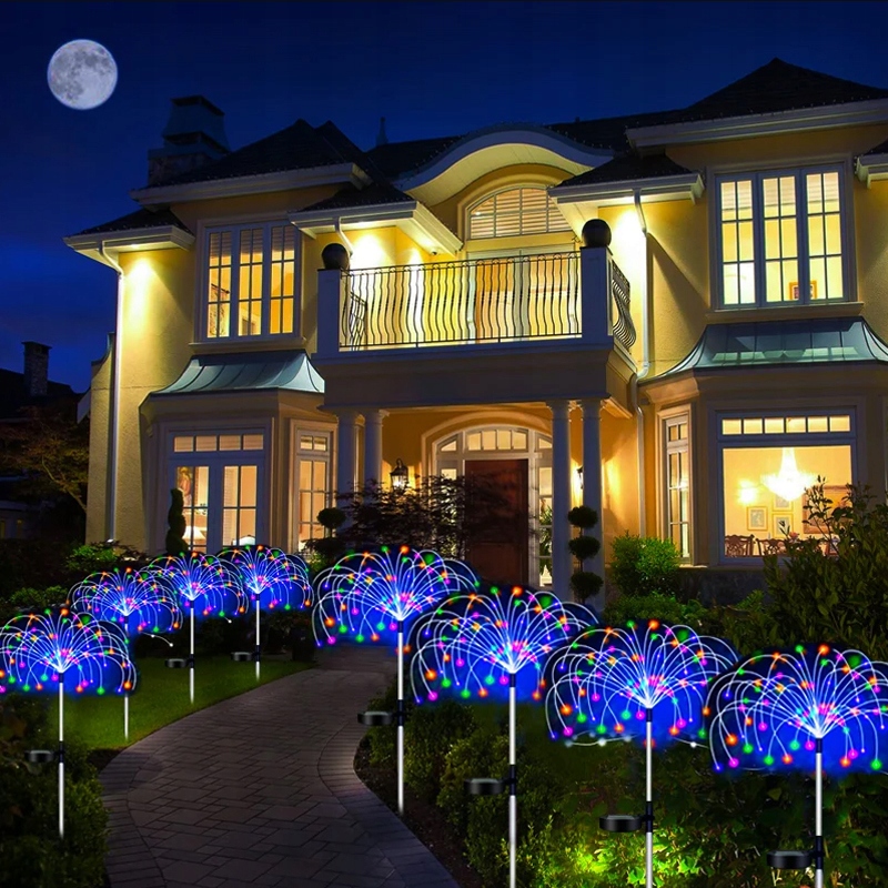 Сонячний феєрверк має два режими освітлення. Коли перемикач повернутий у положення ON, це миготливий режим, перемикач знаходиться у стані OFF у середньому положенні, а положення OFF є режимом постійного світла. Це креативний подарунок для друзів або сусідів на Різдво, Хелловін і День подяки. Цей зовнішній декоративний світильник освітлюватиме тераси, клумби, сади, двори, огорожі, тротуари та доріжки тощо.