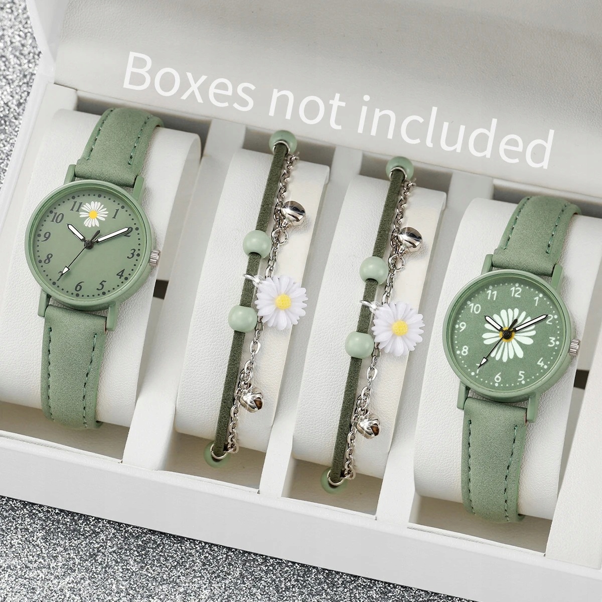 4pcs/Набір моди зеленого шкіряного ремінця PU Квітковий кварцовий годинник з браслетом (поле не включено)