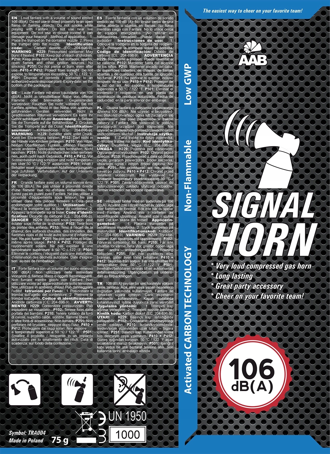 AABCOOLING Signal Horn 75g — це не що інше, як остання модель труби зі стисненим повітрям від AABCOOLING, яка використовує технологію активованого вугілля та негорючий газ. Звук розпилювальної труби потужністю до 106 дБ(А) приверне до вас увагу, де б ви не були! Високий тиск газу в безпечній ємності гарантує вам тривалий гудок. Інноваційний дизайн газових фанфар був розроблений, щоб зробити звук сигнальної труби чітким і гучним. Зазвичай використовується як ручний звуковий сигнал під час спортивних змагань, пробіжок, кемпінгу, регат, полювання.
