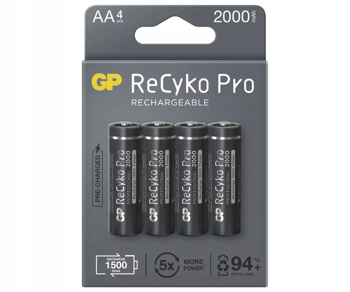 Акумулятори GP ReCyko Pro є ефективними та зручними джерелами енергії, придатними для багатьох застосувань. Усі моделі серії Pro залишаються зарядженими тривалий час і можуть заряджатися до 1500 разів. GP ReCyko Pro використовує спеціальну технологію, завдяки якій, навіть якщо вони зберігаються в ящику протягом 60 місяців, вони зберігають 70% накопиченої енергії. Це низький рівень саморозряду. Завдяки цьому ми можемо використовувати їх одразу без необхідності поповнення. Після такого тривалого часу звичайні батареї повністю розрядяться, і ці елементи можна заряджати про запас і брати з собою без зарядного пристрою.