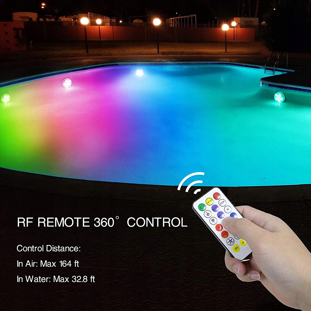 ► [МАКС. 200 футів / 61 М радіочастотний діапазон] - із радіочастотний пульт дистанційного керування має додатковий і глибший діапазон до 200 футів/61 м у повітрі, 16,4 футів/5 м у воді (ІЧ-пульт дистанційного керування може керувати лише в межах 2 футів), один пульт дистанційного керування може керувати кількома вогнями, не потрібно націлюватись на вогні. За допомогою пульта дистанційного керування ви можете легко змінювати кольори, установлювати таймер, регулювати яскравість або дистанційно змінювати шаблон освітлення.