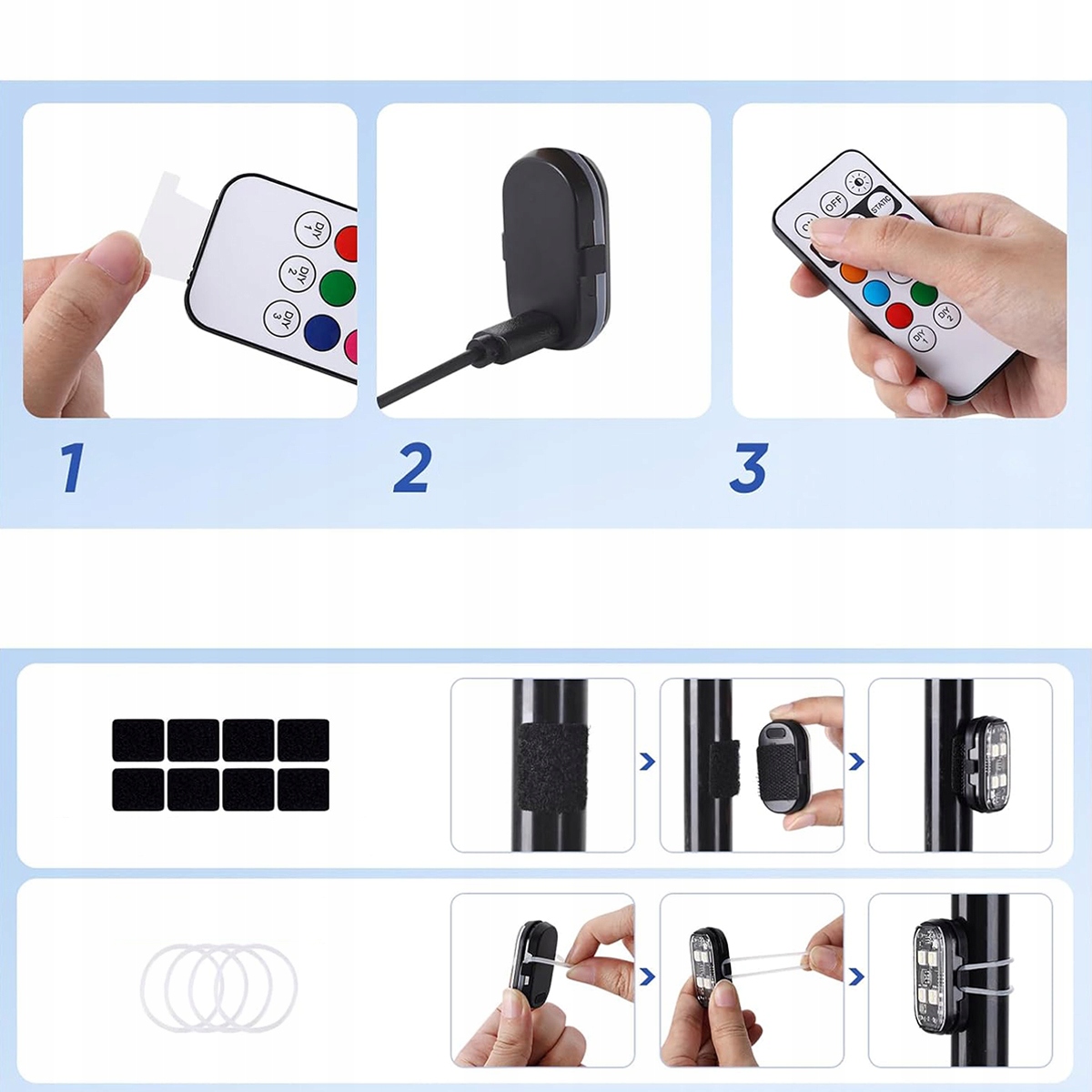 🌈ЯК ПОЧАТИ – Заряджайте кожен ліхтарик протягом 5 секунд, потім від’єднайте кабель. Натисніть і утримуйте кнопку «ON» на пульті дистанційного керування, щоб увімкнути його. Це потрібно зробити протягом 1 хвилини після від’єднання кабелю.