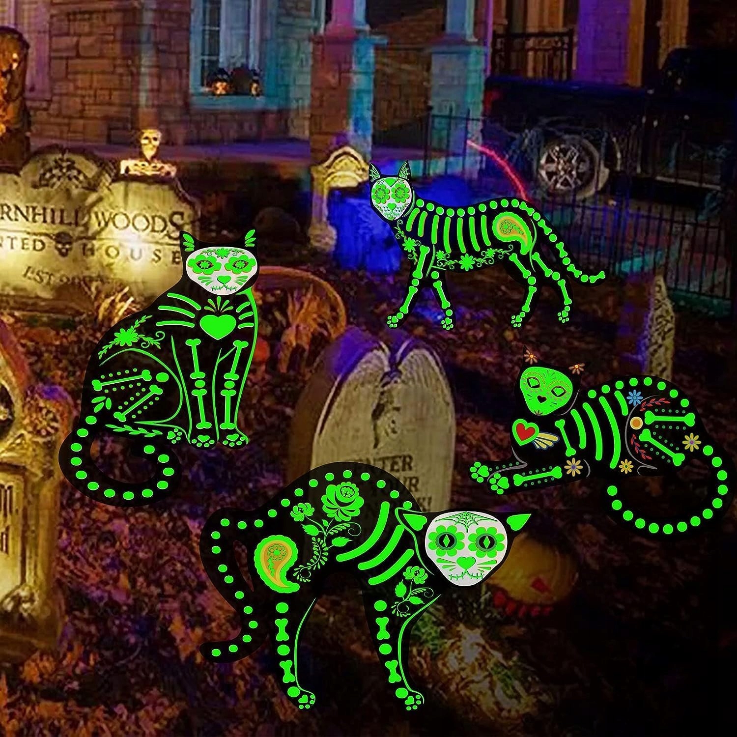 4x Dekoracja Halloween Fluorescencyjny świecący kot szkielet + naklejki