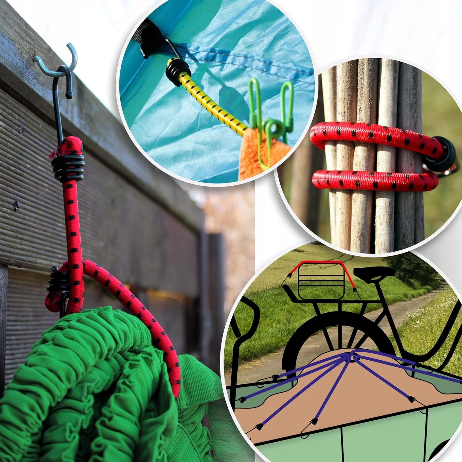 Гумові стрічки є еластичними, тому вони можуть адаптуватися до форми та розміру рукоятки. Оздоблені металевими гачками, завдяки яким їх можна кріпити до різних поверхонь, наприклад, до ременів, металевих частин, багажників, дахів. Кожна гумка становить 60 см без розтягування. Вони характеризуються високою гнучкістю та довговічністю.