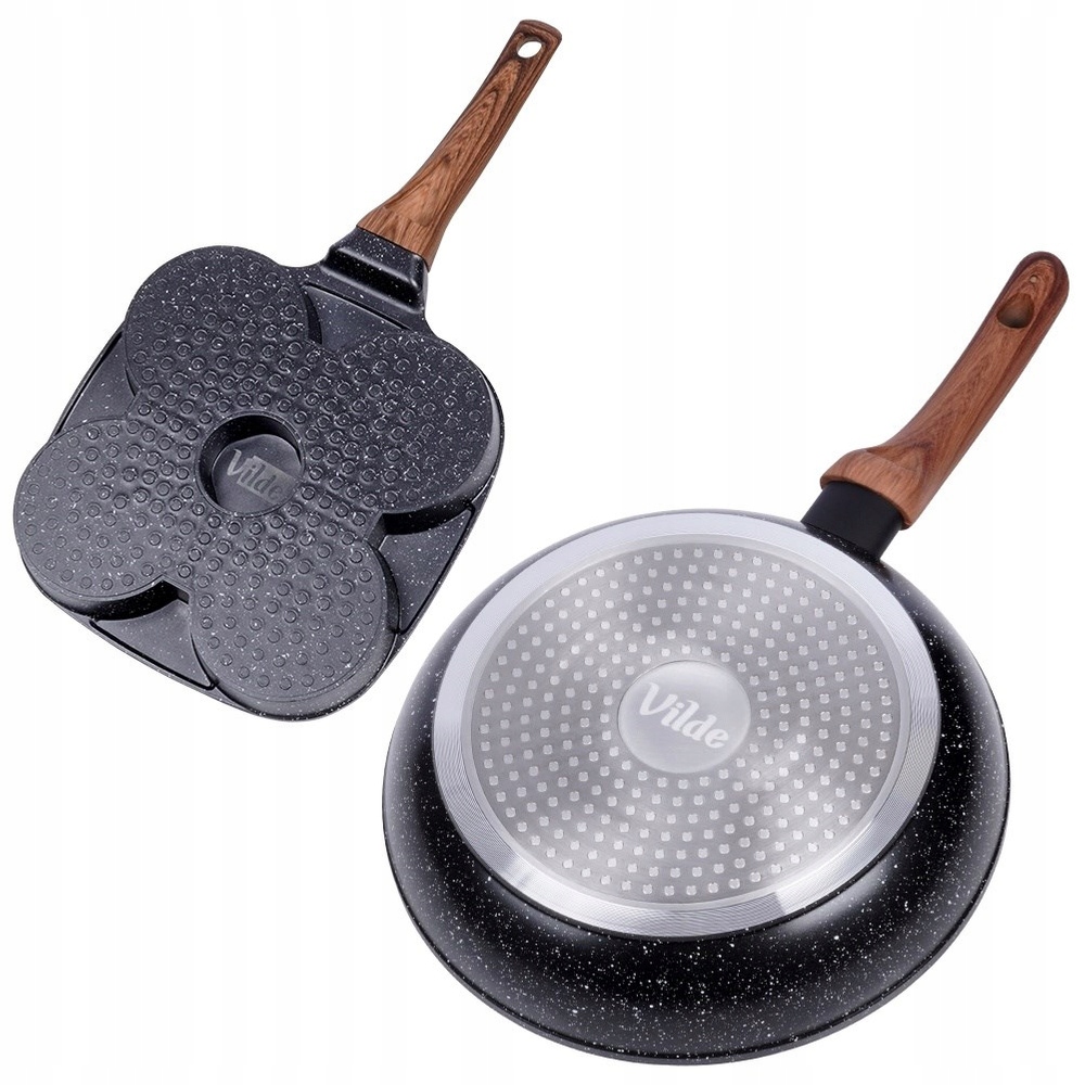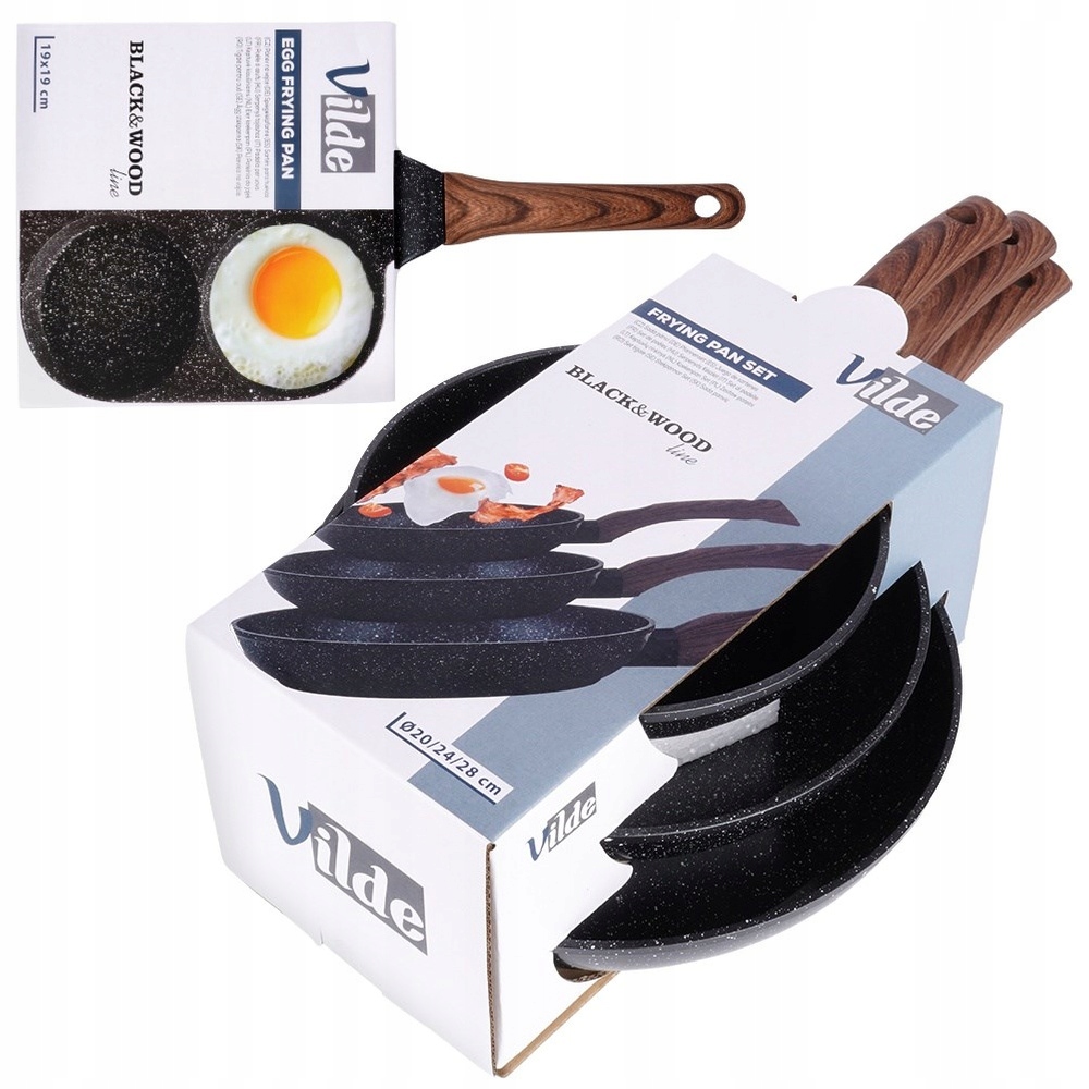 набір трьох класичних каструль та одна яєчна сковорода з 4 отворами. Включає: каструлю з діаметром 20 см (довжина 36,5 см, висота каструлі 4,5 см, висота з ручкою 6 см), каструля з діаметром 24 см (довжина 43 см, висота каструлі 5 см, висота ручки 7 см) і з висотою 28 см. 5,5 см, висота з ручкою 7,5 см), яєчна сковорода з розмірами 19 х 19 см (довжина 36,5 см, висота каструлі 2 см, висота з ручкою 5 см). Каструлі зберігалися в модному поєднанні чорного та дерева, завдяки якому вони виглядають ефективно на кухні. Необхідний на кожній кухні. З їх допомогою смажте м'ясо, овочі та млинці. Виготовлені з найвищої якості матеріалів, належним чином використовуються протягом багатьох років. оригінальний продукт Vilde від Black & Wood. вироблявся відповідно до європейських стандартів.