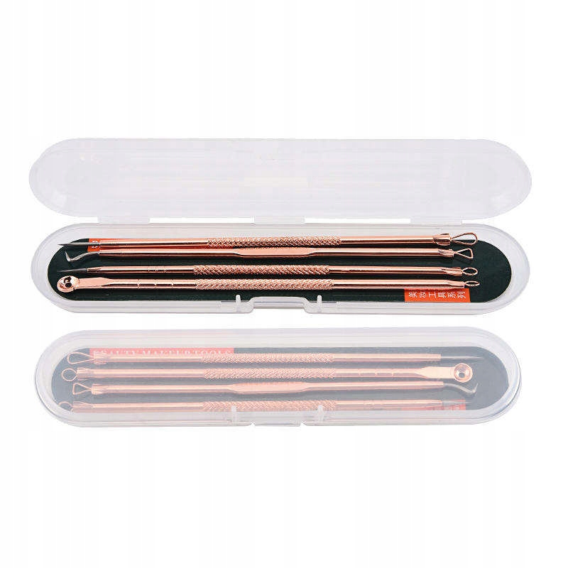 Набір апаратів для видавлювання та видалення чорних крапок, прищів і чорних крапок - це косметичний засіб, який допомагає в ефективному видаленні забруднень шкіри. Це ручні інструменти, які складаються з чотирьох пінцетів із різними наконечниками.