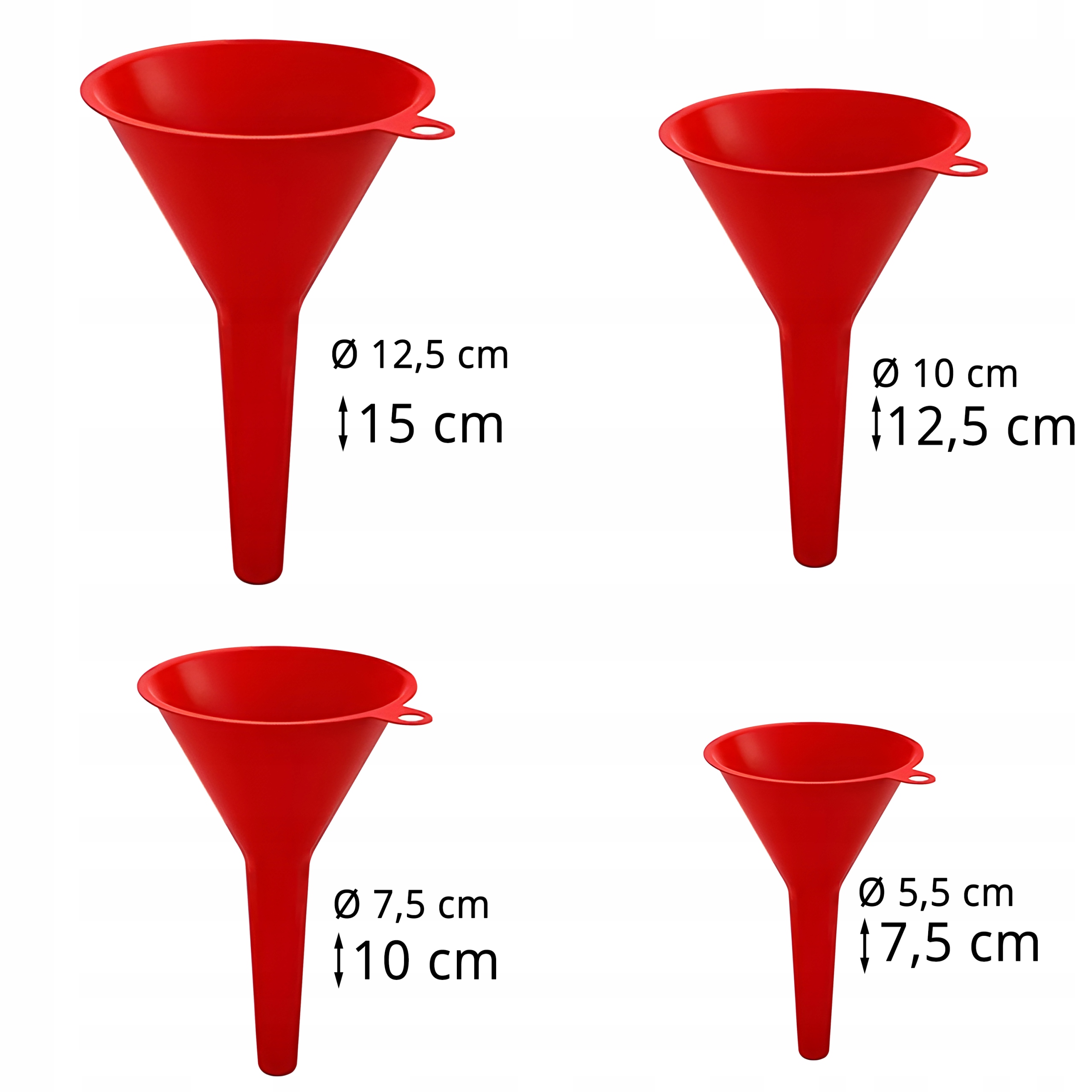 Набір лійок 4 різних розмірів (52/76/100/120 мм) пропонує універсальне використання, дозволяючи наповнювати рідини та сипучі продукти. Завдяки різним діаметрам ви можете налаштувати воронку під конкретні потреби, забезпечуючи точність і комфорт під час використання. Цей набір забезпечує гнучкість і зручність у повсякденній діяльності, будь то розливання рідини чи додавання сипучих продуктів.
