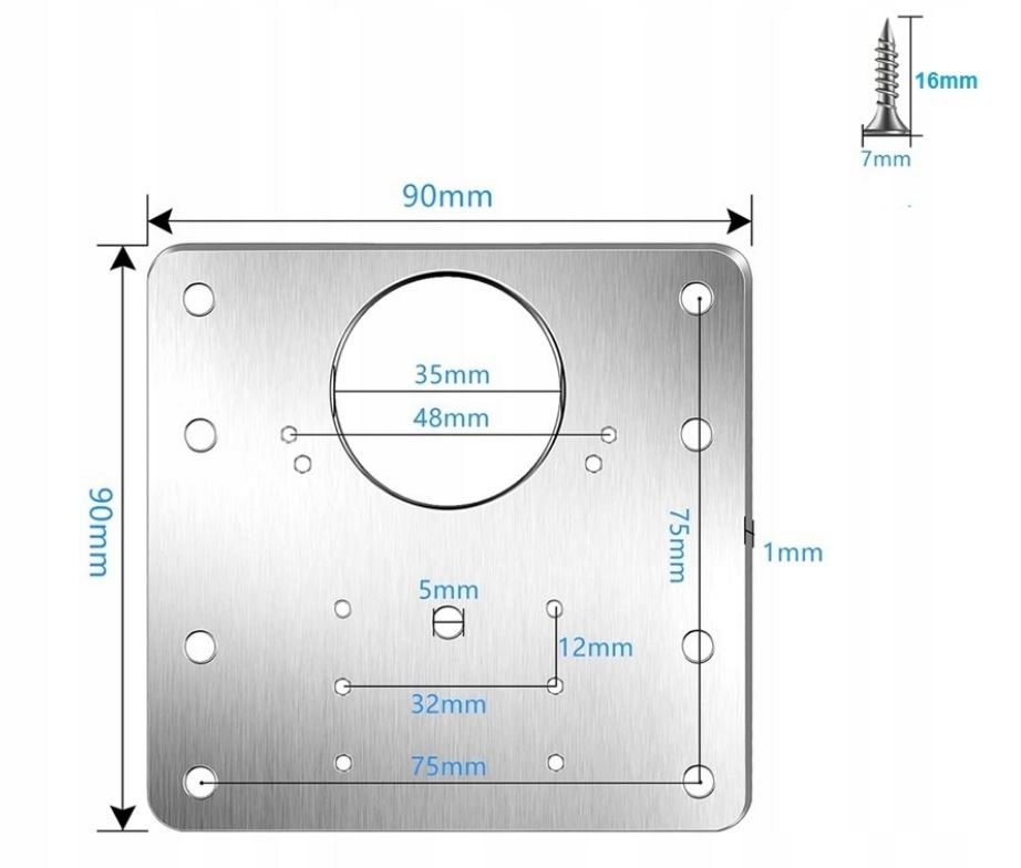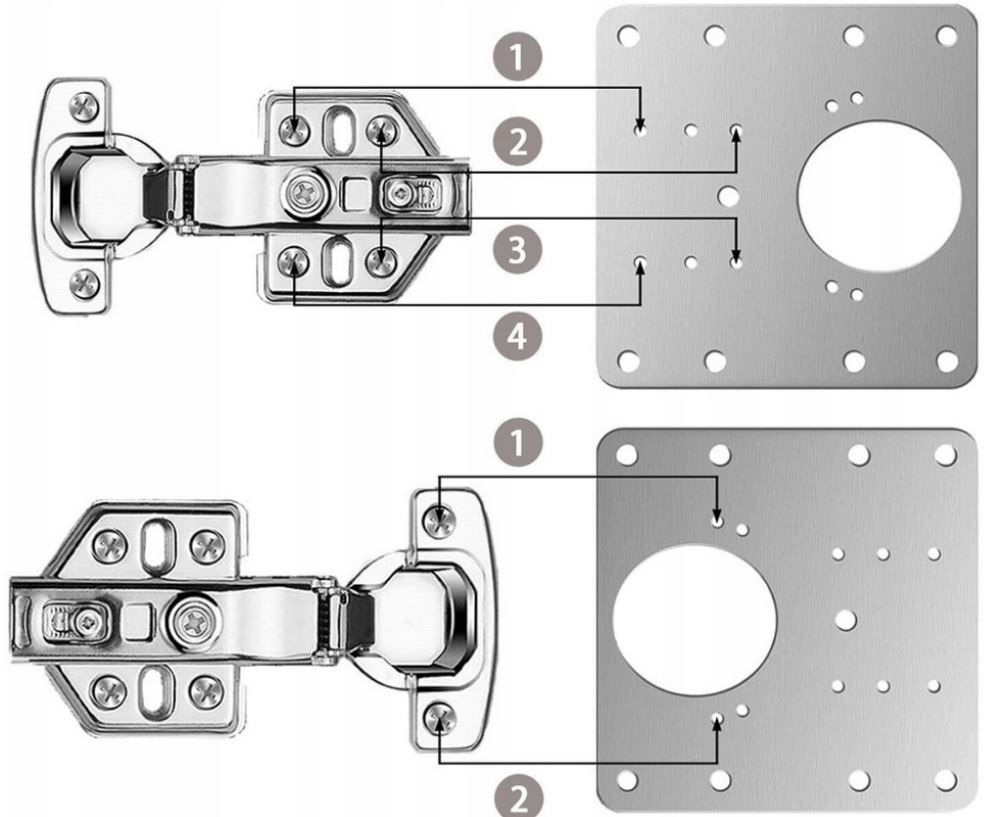 5️⃣ Прикрутіть петлю до ремонтної пластини в два протилежних отвори. Залежно від типу петлі та відстані в шафі від краю виберіть одну пару отворів.