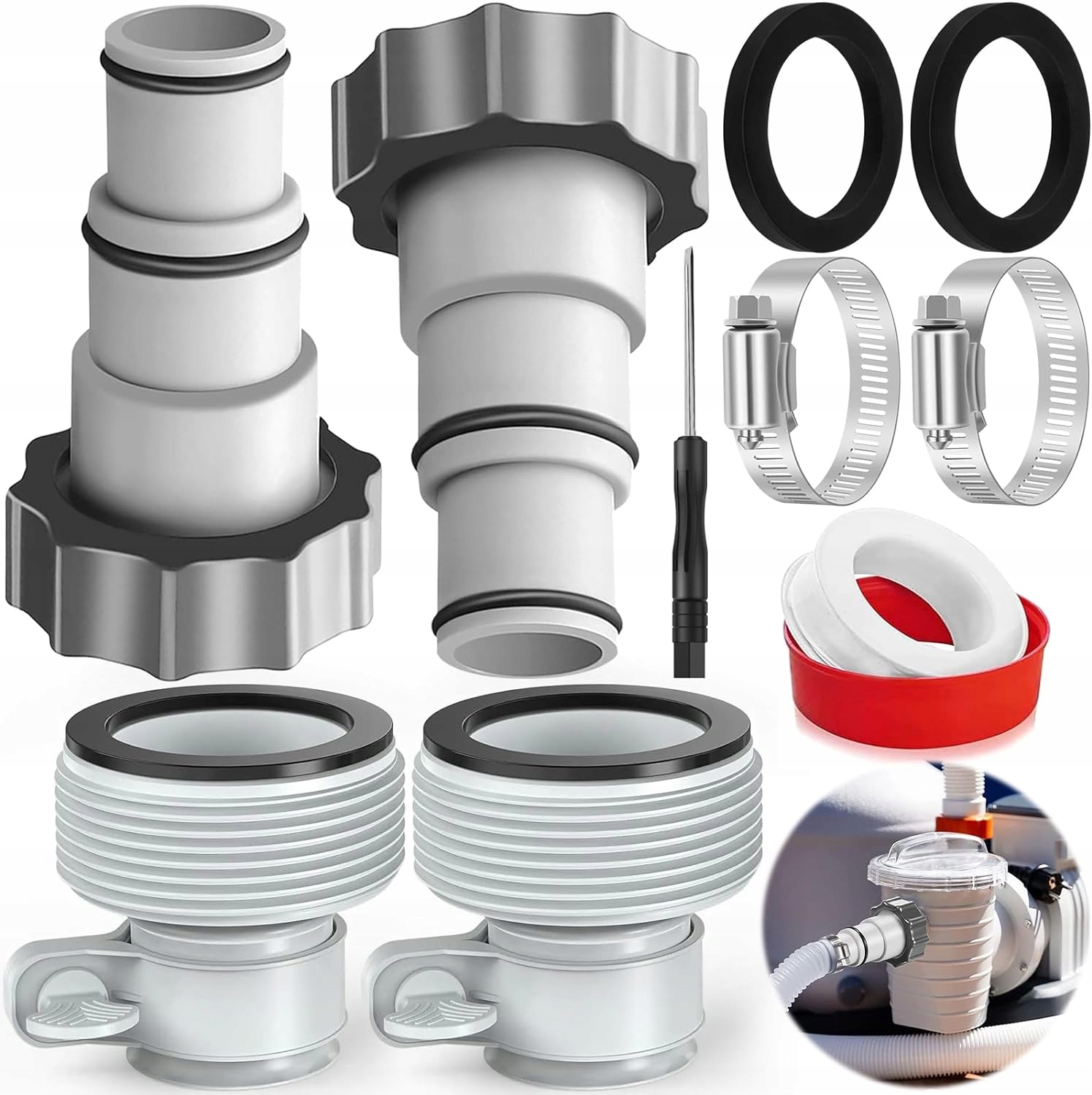 - Набір адаптерів для басейну - Набір із 4 адаптерів для шлангів розміром 32 на 38, достатніх для використання або заміни їх у повсякденному житті. 4 кабельні стяжки, 2 гелеві прокладки, 1 необроблений ремінь і 1 маленька викрутка для більшої водонепроникності.