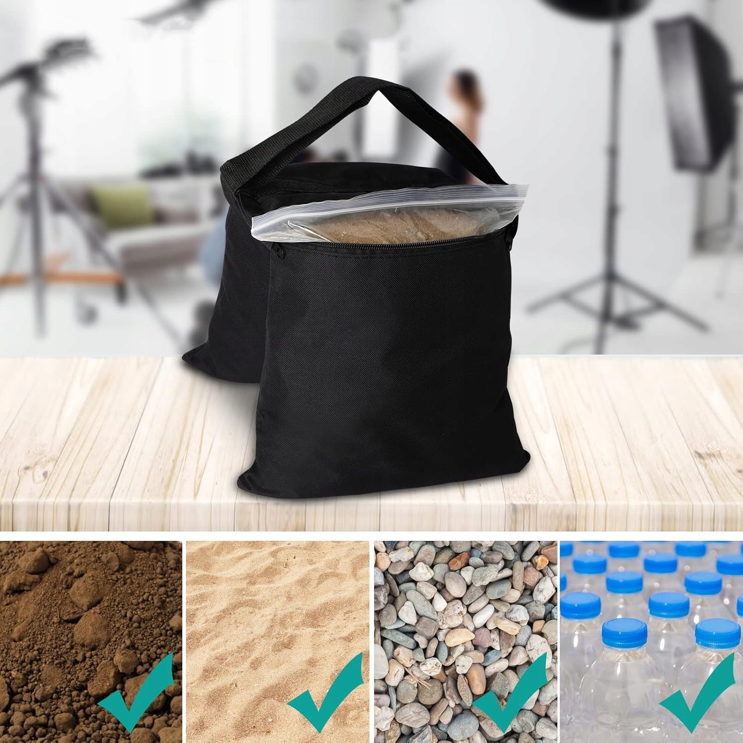 - Простий у використанні, спочатку налийте пісок або гравій у щільний поліетиленовий пакет, а потім покладіть пластиковий пакет у пакет з піском і нарешті повісіть його на місце, де він потрібно. Фолька запобіжить, щоб Оксфордський мішок не забруднив, алюмінієві затискачі допоможуть прикріпити мішок з піском.