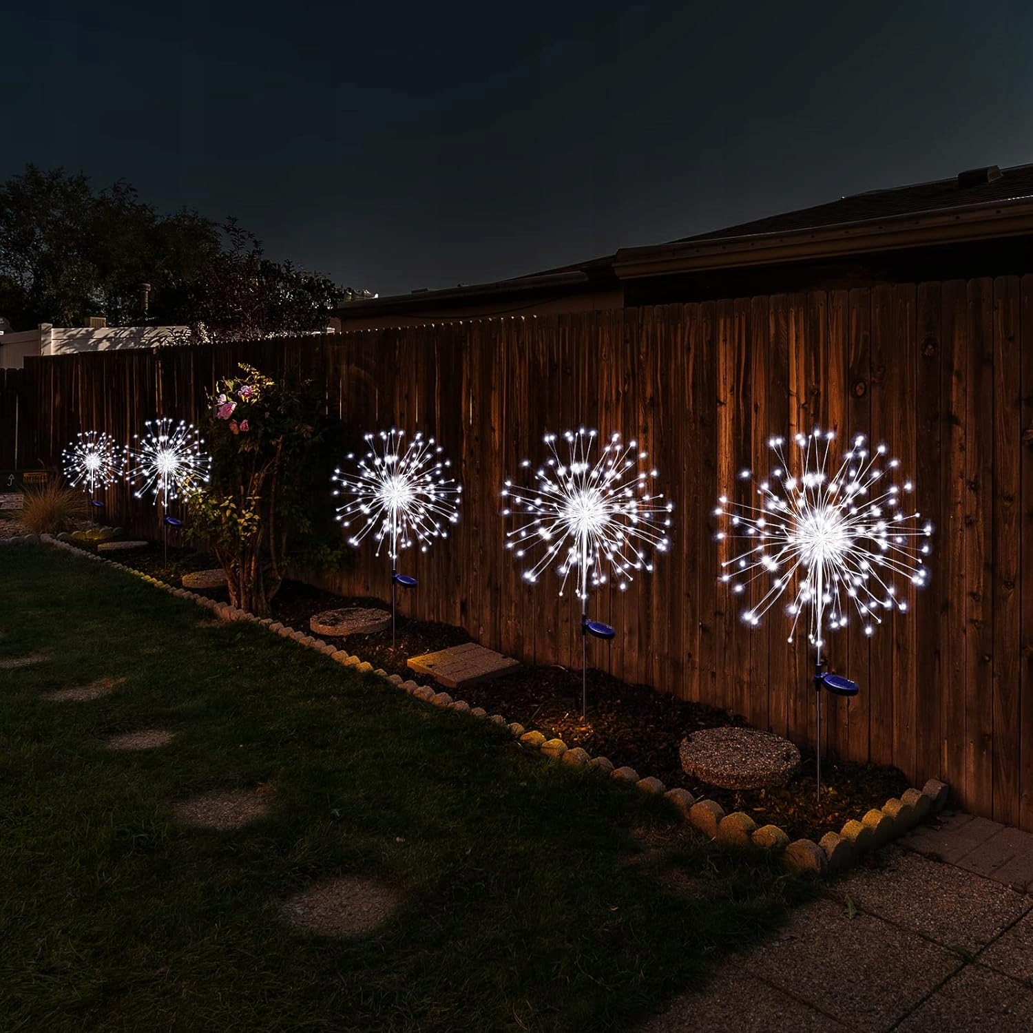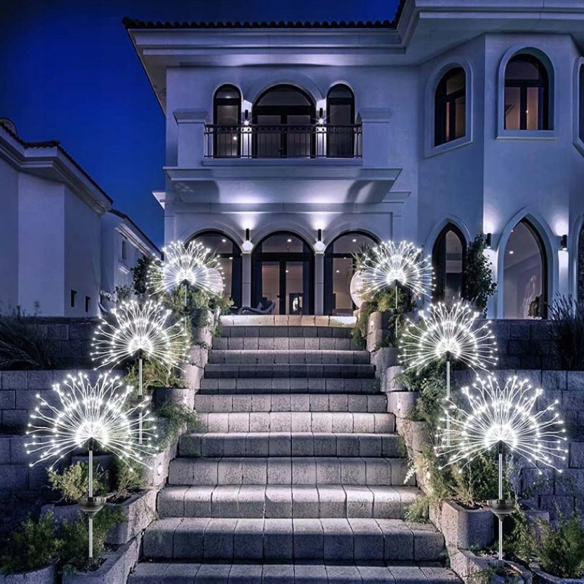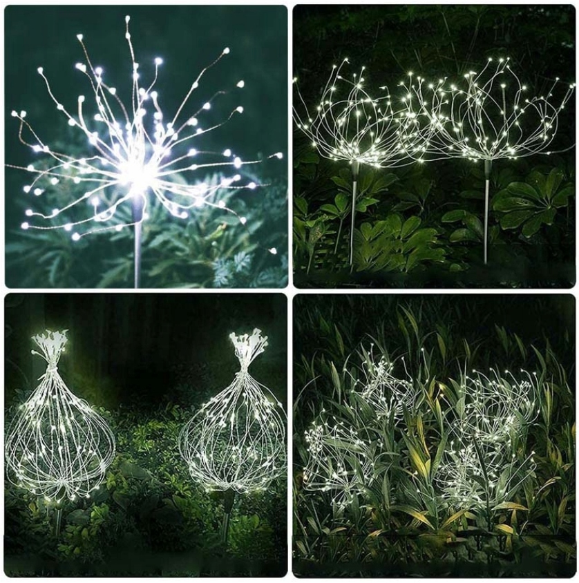 Сонячний феєрверк має два режими освітлення. Коли перемикач встановлено в положення ON, це миготливий режим, перемикач знаходиться у стані OFF у середньому положенні, а положення OFF є режимом постійного світла. Це креативний подарунок для друзів або сусідів на Різдво, Хелловін і День подяки. Це зовнішнє декоративне освітлення освітлюватиме тераси, клумби, сади, двори, огорожі, алеї та доріжки тощо.