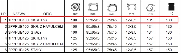 Набір складається з чотирьох коліс, оснащених пластиною для кріплення. У набір входять чотири колеса з кодом 1PPPUB100K2, у таблиці під позицією 1.