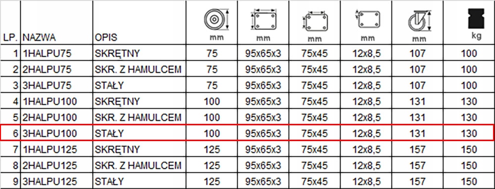 Набір складається з чотирьох коліс, оснащених пластиною для кріплення. У набір входять чотири колеса з кодом 3HALPU100K2, у таблиці під позицією 6.