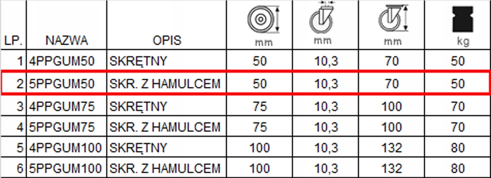 Колесо складається з поліпропіленової втулки та немаркої гумової шини, має підшипник ковзання, версія з чохлом. У набір входять чотири набори, встановлені на код отвору 5PPGUM50. У таблиці під п.2. У комплект коліс входять чотири гвинти M10x30 Allen.