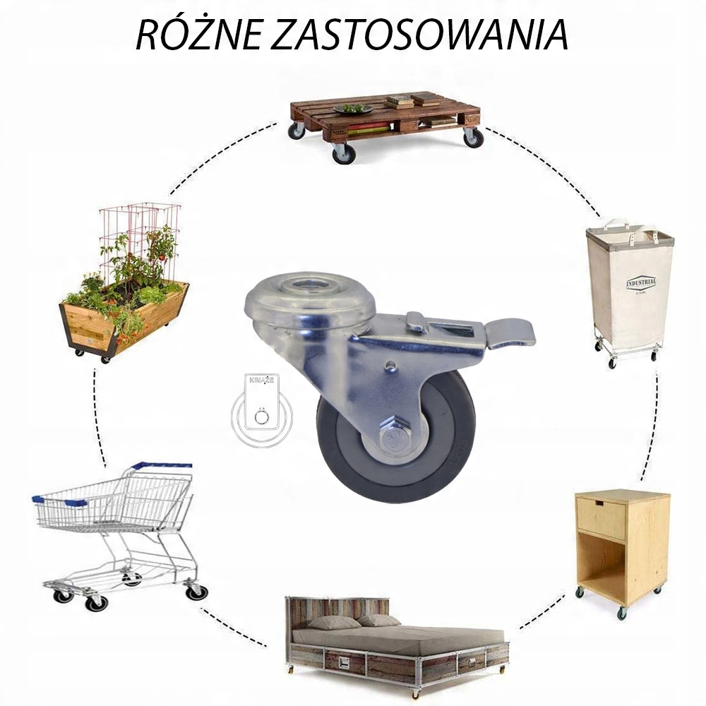 - КОЛЕСО складається з поліпропіленової втулки та гумової шини без слідів, має підшипник ковзання. . Колеса мають міцність 50 кг на колесо. Вони повільно зношуються, стійкі до пошкоджень, поглинають удари та вібрацію. Вони обертаються на 360 градусів, полегшуючи маневрування меблями або коляскою. Вони плавно обертаються на твердих і гладких поверхнях, як-от бетон, з дуже невеликим тертям.