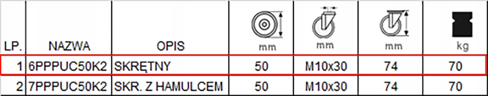 Колесо складається з поліпропіленової втулки та поліуретанової шини без слідів, має подвійний кульковий підшипник. Набір включає чотири колеса, встановлені на різьбовий штифт M10x30, код 6PPPUC502K. В таблиці під п. 1.