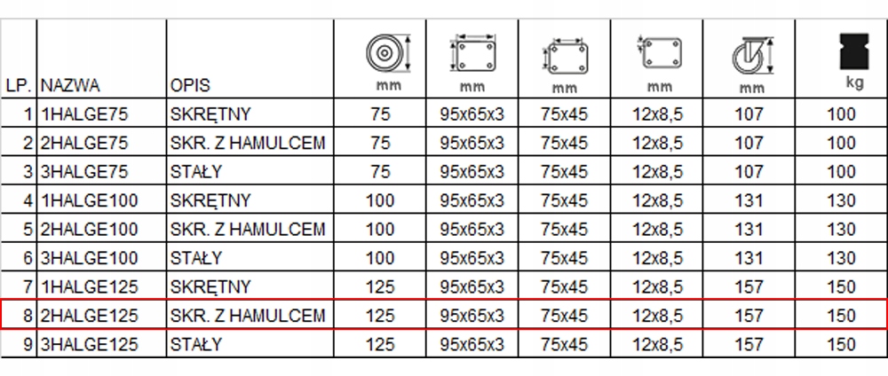 Набір складається з чотирьох коліс, оснащених кріпленням гальмівної плитки. Комплект включає чотири колеса, з кодом 2halge125k2 , в таблиці під силою позиції 8 + .