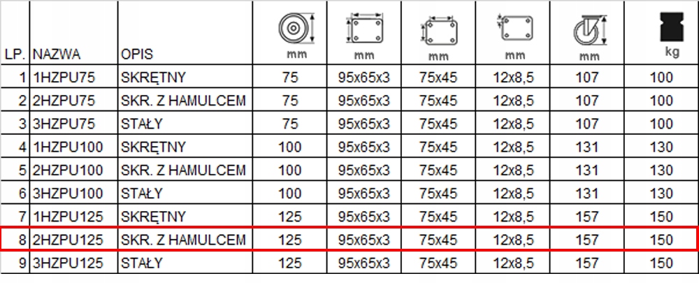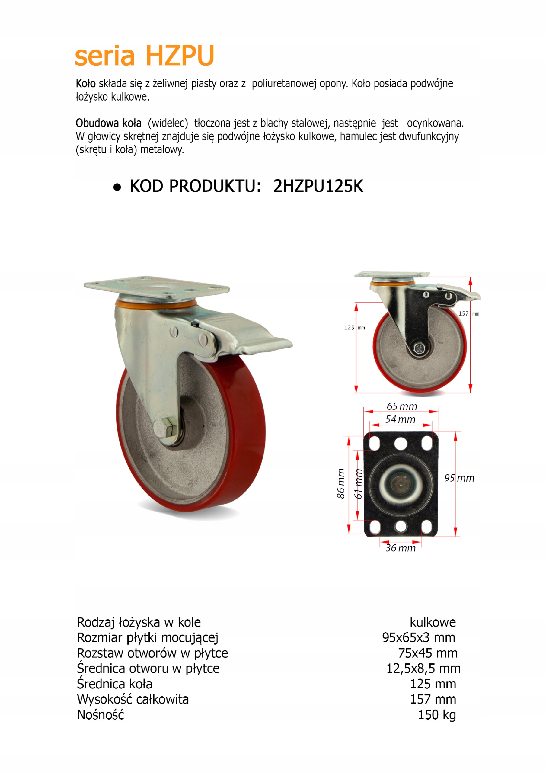 Набір складається з чотирьох коліс, оснащених кріпленням гальмівної плитки. Набір складається з чотирьох коліс, з кодом 2HZPI125K2 , у таблиці під пунктом 8 . 4 від 33,7 мм труби.