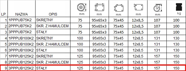 Набір складається з чотирьох коліс, оснащених кріпленням тарілки. Комплект включає чотири колеса з кодом 3ppub125k2 , в таблиці під положенням 9 + футів . Корпус покривається оцинкованим. Підшипник подвійного кулі, вага набору 5.376 кг. зацікавився різним розміром набору, типом кола тощо.