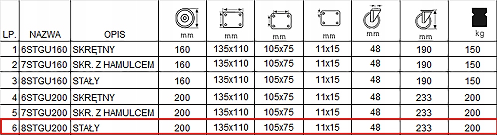 В набір входять чотири колеса, встановлені на штифт, код 8STGU200/40, в таблиці під п.6.