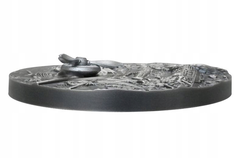 Ця монета викарбувана з двох унцій чистого срібла і вражає своїми деталями. Реверс монети прикрашений горельєфом із красивим гравіюванням із зображенням битви, що відбулася на Тихому океані та над ним. У верхній частині монети вставка у вигляді...рухомого пропелера! Цей інноваційний підхід підкреслює роль авіації у цій важливій битві, яка стала поворотним пунктом у війні на Тихому океані.