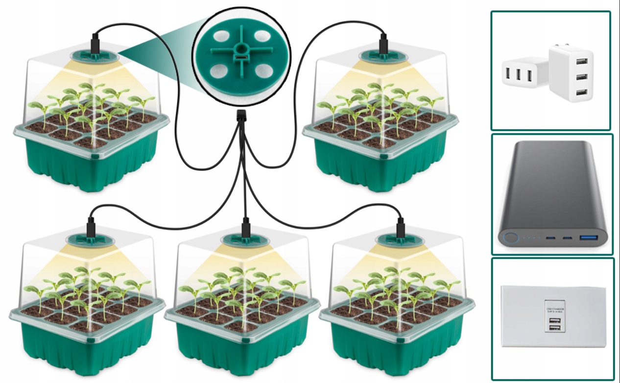 Верхній купол - це також перемикач вентиляції та світлодіодна лампа для вирощування, що забезпечує рослинам з повним спектром світла. Ми надаємо USB -кабель з 5 портами. Для одночасного з'єднання 5 лотків для вирощування з обкладинками. Його можна зручно використовувати вдома та офіс.