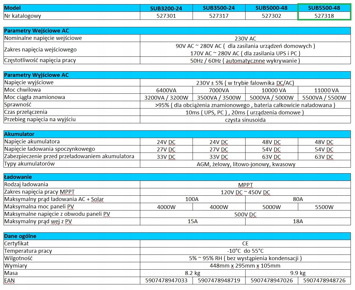 Омрежевий сонячний інвертор SUB5500-48 5,5 кВт 48 В MPPT 80 A, PV 500 В макс., WiFi