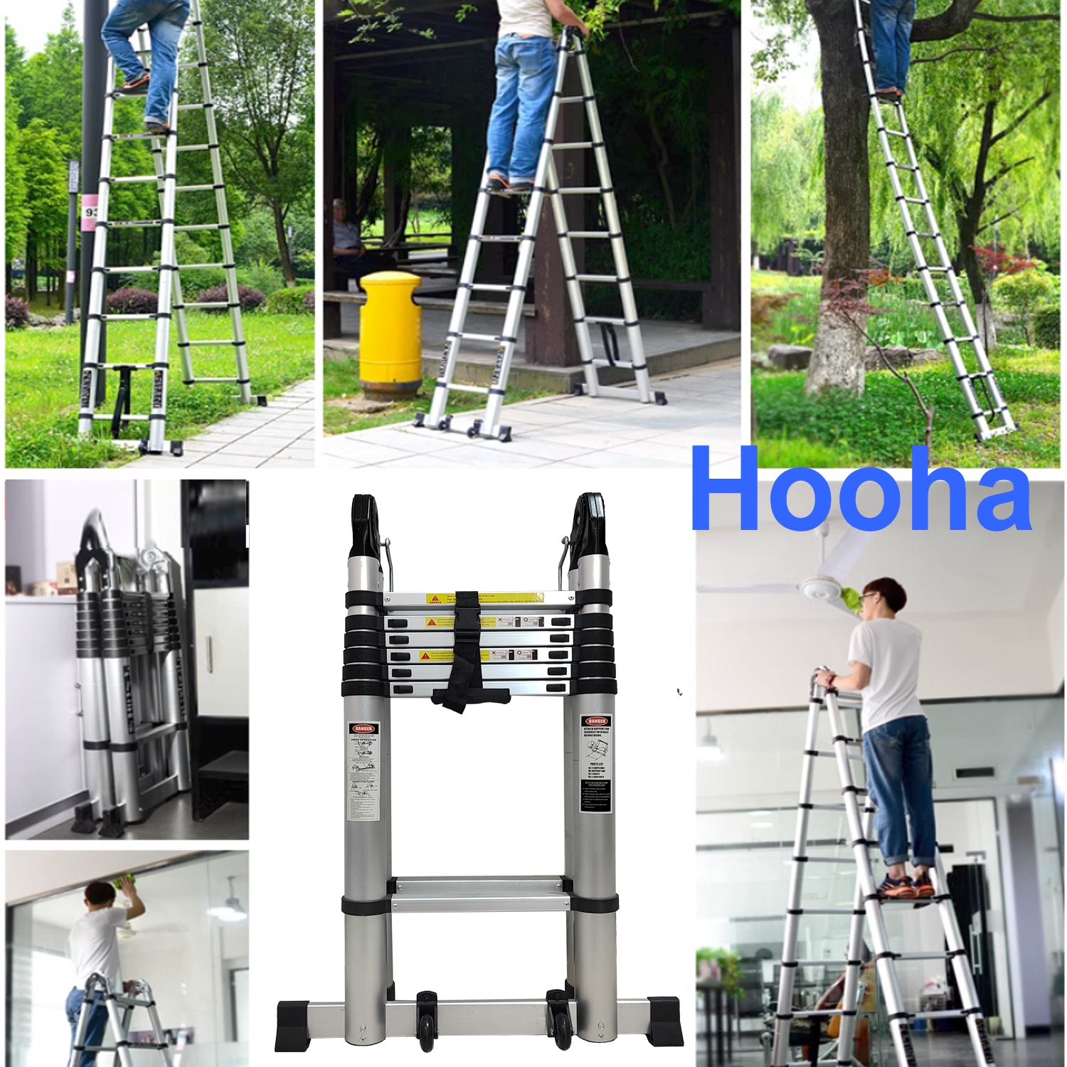 - Багатофункціональні телескопічні драбини Hooha можна використовувати як драбини А-рами 2,9м+2,9м. Це також може бути джерелом для входу висувної драбини 5,8 м. Завдяки незалежним замкам догляду на висоті драбини.