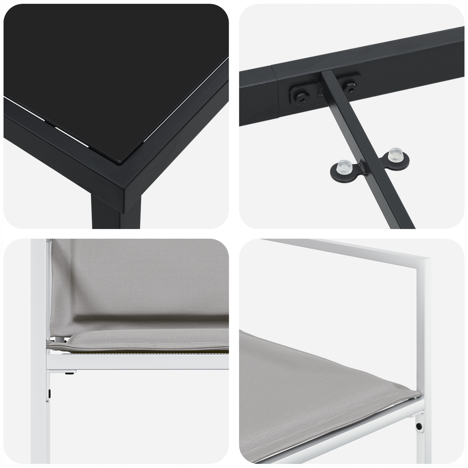 - Постійні матеріали: Виготовлений з текстового матеріалу, стійкого до УФ, цей набір стійкий до сонця та після складних погодних умов, він все ще зберігає свій елегантний вигляд. Особливості: Кожне крісло має товсті подушки світло -сірого кольору, що робить їх комфортними під час довгих прийомів їжі або зустрічей.