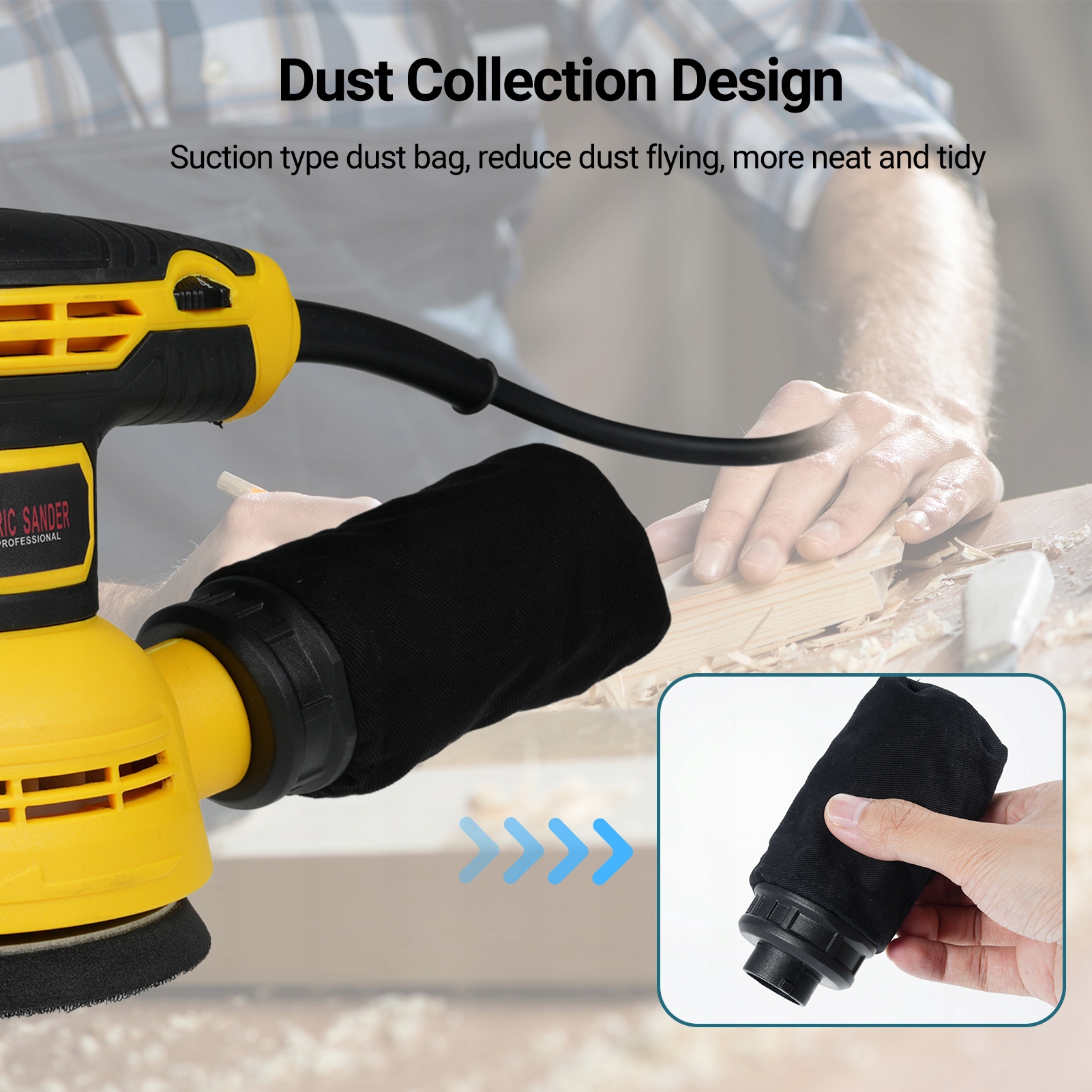 3. Висока ефективність збирання пилу: ця електрична шліфувальна машина має 8 вакуумних отворів; Мішок для пилу має вищу ефективність збирання пилу, ніж контейнер для пилу; Мішок для пилу є повітропроникним, що запобігає повторному потраплянню пилу в двигун, подовжуючи термін служби орбітального обслуговування.