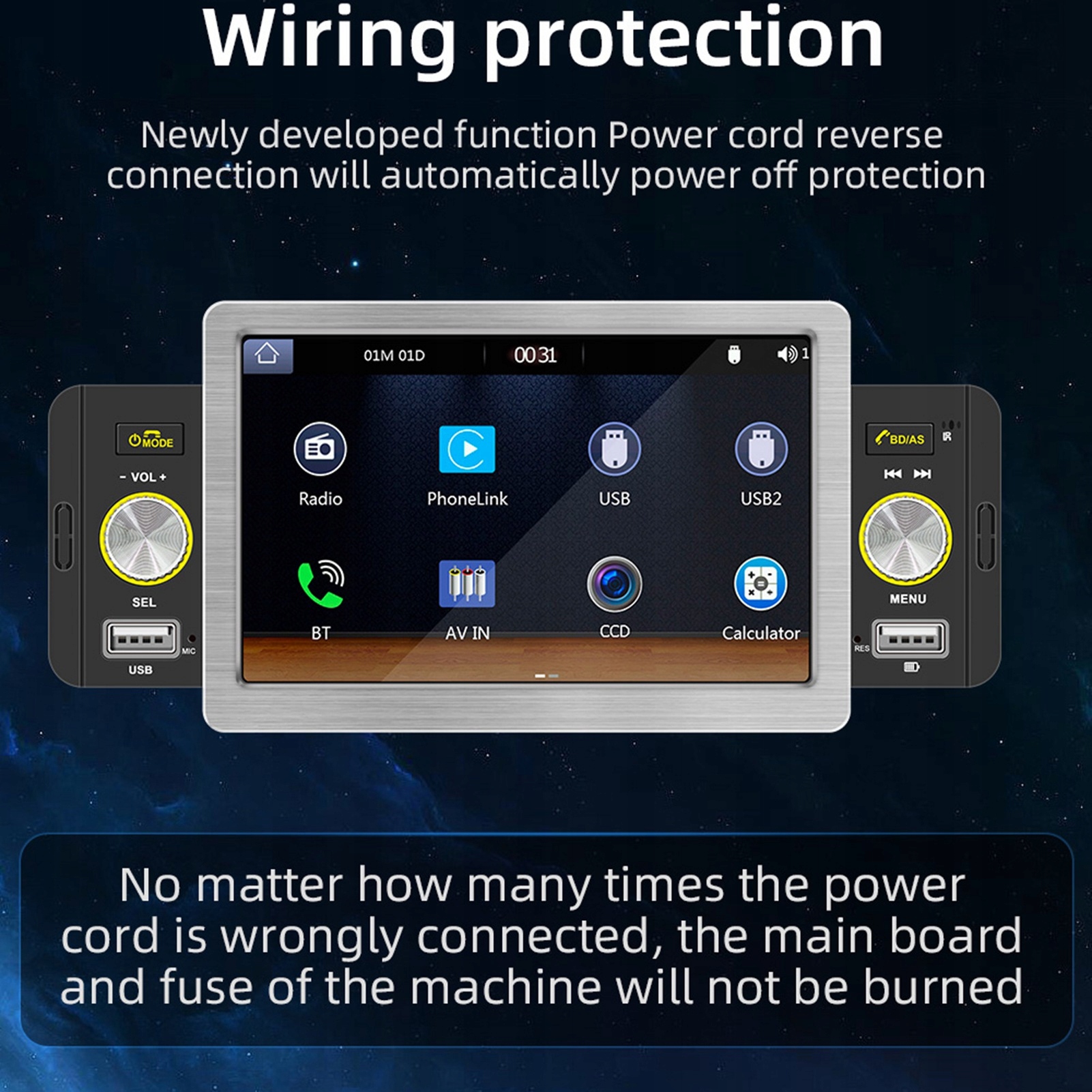- 5-дюймовий портативний автомобільний плеєр із високим цифровим сенсорним екраном, підключенням BT, підтримкою Wireless Carplay і Android Auto, звільнить ваші руки та зробіть водіння безпечнішим. Підтримується допомога при їзді заднім ходом, щоб допомогти вам припаркувати свій автомобіль у потрібному місці.