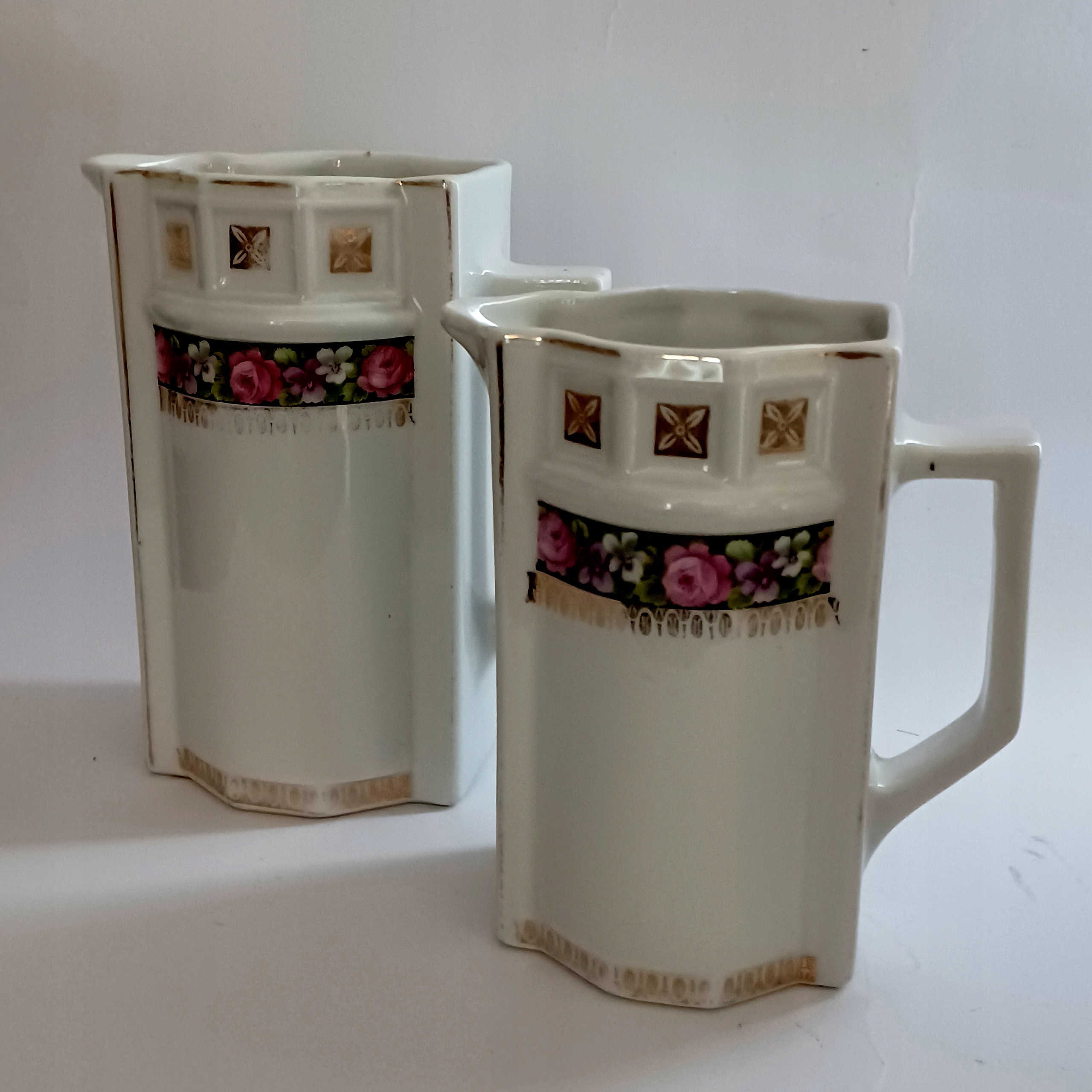П'ять глечиків, прекрасне квіткове оздоблення, в цілому дуже гарний стан - потертості в останньому глечику РОЗМІРИ: 16 см, 14 см, 11 см. 10 см, 8 см. Ширина: по порядку: 14 см, 13 см, 9 см, 8 см, 7 см.