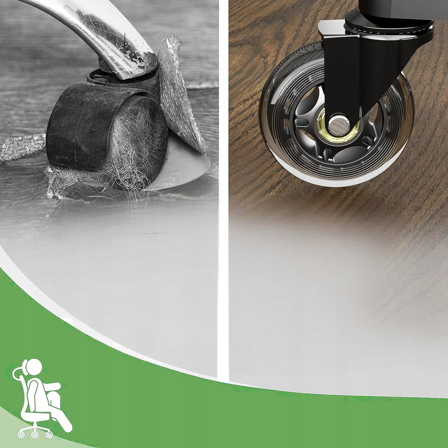 【ПОДОВКИ ДЛЯ ОФІСНОГО КРІСЛА АБО ЗАХИСНОГО КИЛИМКУ НА ПІДЛОГУ НЕ ПОТРІБНІ】- Наші колеса для офісного крісла НІКОЛИ не подряпають, не забруднить і не пошкодять килим на вашому столі. Завдяки коліщаткам офісного крісла ви можете без зусиль і безпечно ковзати цілий день по дерев’яній, паркетній, ламінатній, вініловій, плитковій і килимовій підлозі.
