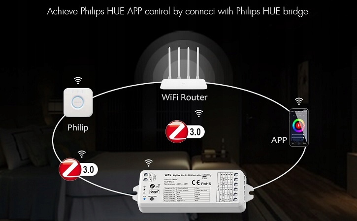 WZ5 – це 5-канальний світлодіодний приймач, який використовує зв’язок ZigBee (tuya) і призначений для керування монохроматичним освітленням зі змінною колірною температурою CCT, багатоколірним RGB, RGBW, RGB + CCT. Він живиться від напруги в діапазоні 12-24 В постійного струму (джерело живлення постійної напруги) і має максимальне струмове навантаження 3 А/канал. Використовуючи цей контролер, ви можете зменшувати або посилювати освітлення, змінювати його колірну температуру CCT 2700-6500K і керувати кольорами. Зв'язок з додатком Tuya забезпечується за допомогою мобільних пристроїв, таких як смартфони або планшети. Опціонально для радіоуправління можна використовувати пульти дистанційного керування або світлодіодні панелі. Детальні дані містяться в каталожній картці виробника, що додається.