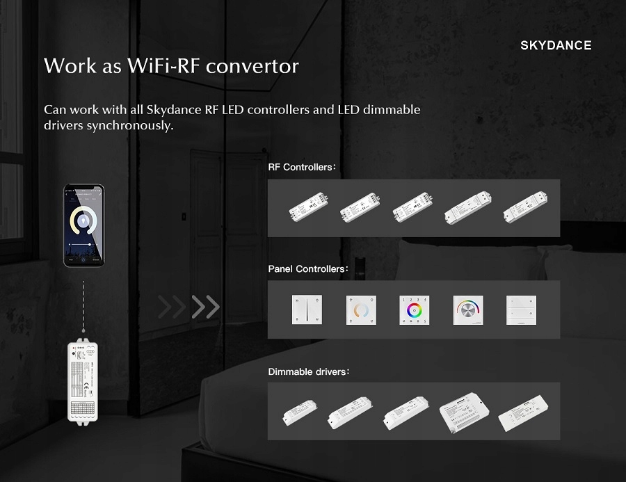 - Функції 5 в 1 для керування однокольоровою світлодіодною стрічкою, змінна колірна температура, RGB, RGB+W, RGB+CCT