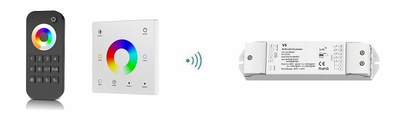 Для зв'язку з пристроєм використовується радіозв'язок 2,4 ГГц, дротовий для універсальних кнопок (push-dim) і мережа Wi-Fi після придбання відповідного модуля. Для бездротового керування приймачем V5 ми використовуємо світлодіодні пульти дистанційного керування або бездротові світлодіодні панелі для освітлення RGB+CCT. Придбавши відповідний модуль, можна отримати доступ до контролера через Wi-Fi через смартфон або планшет. Джерело живлення пристрою 12-48V DC (живлення світлодіодів постійної напруги)