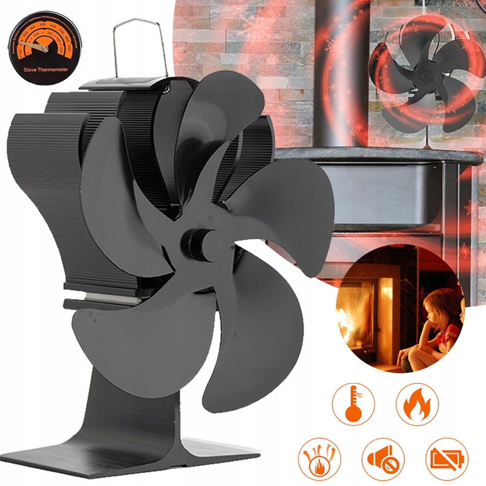 вентилятор печі, що підтримує деревину з 5 лопатками розподіляє більшу кількість теплого повітря, розсіюючи їх по горизонталі навколо будинку, замість того, щоб спрямовувати їх безпосередньо над ступенем. Цей камін вентилятор, що працює на теплі, широко використовується в печах, що підводяться на деревину, газовими печами, печами, що проводяться на деревині, камінам тощо