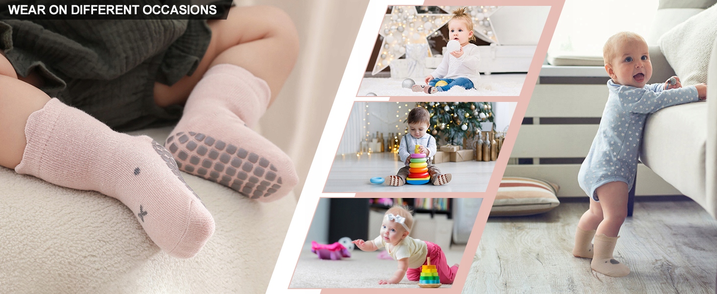 - Дитячі шкарпетки для малюків мають міцні ручки внизу, які охоплюють всю стопу від п’яти до пальців, великі протиковзкі захоплення можуть захистити безпеку вашої дитини, особливо чудово підходить для немовлят, які люблять бігати, стрибати та стрибати вдома.