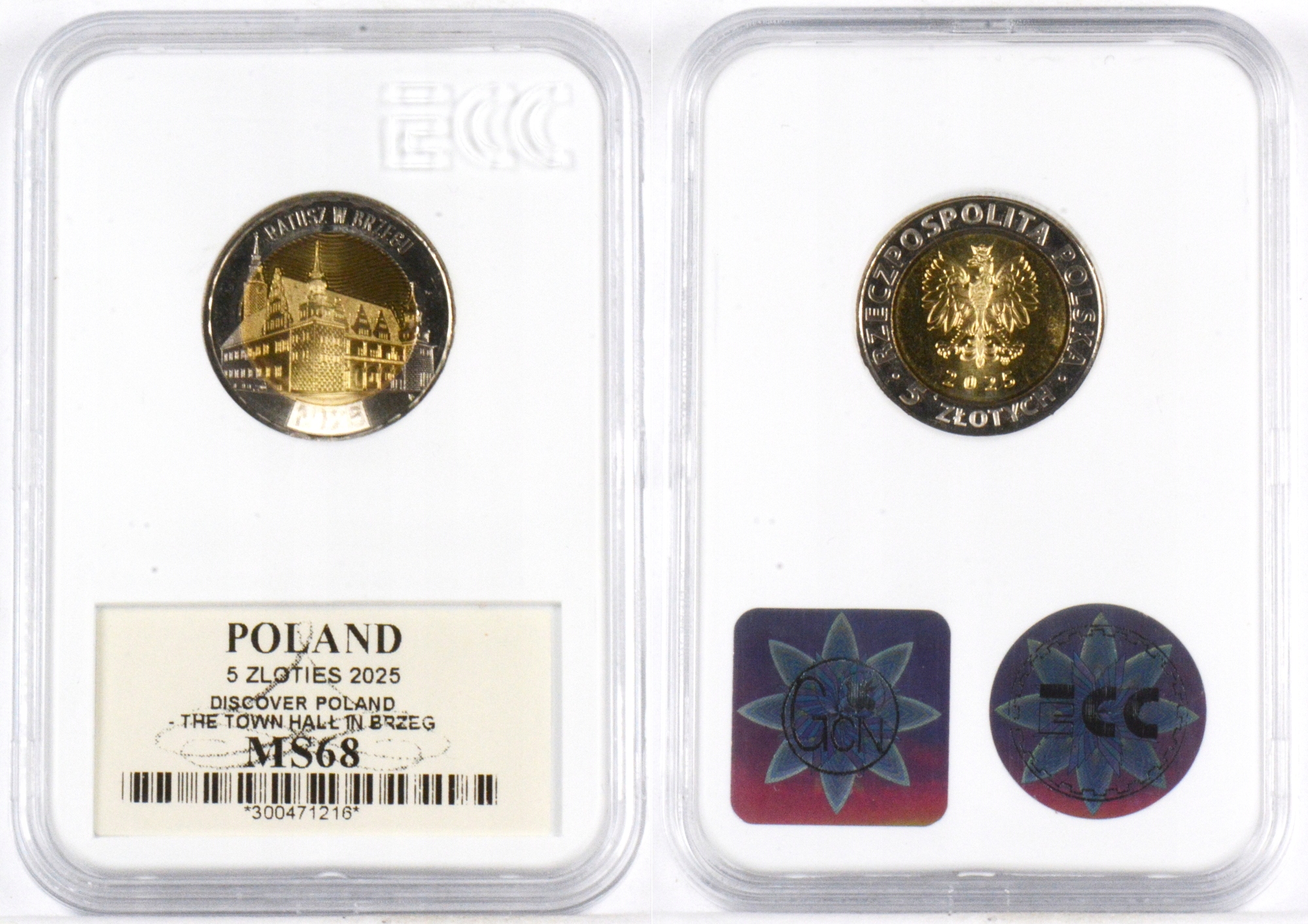 5 PLN 2025 РАТУША В БЖЕГУ MS68 GCN