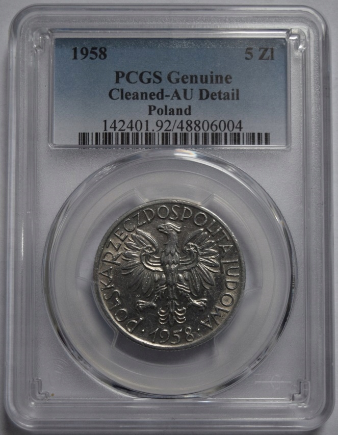 5 PLN RYBAK 1958 WĄSKA 8 - PCGS AU DETAIL