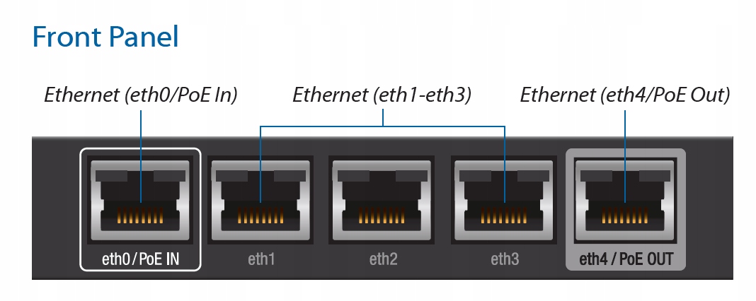 Маршрутизатор може живитися від зовнішнього джерела живлення або від пасивного 24 В PoE. Передача пасивного PoE на вихід eth4 дає змогу живити інший пристрій серії airMAX.