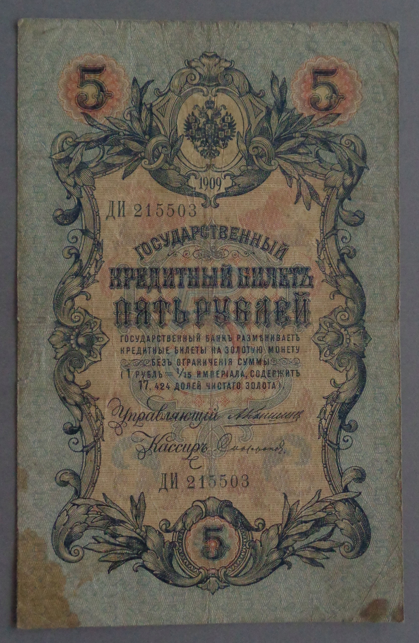 Банкнота 5 рублів 1909 р. Підписи: Конзін, Софронов