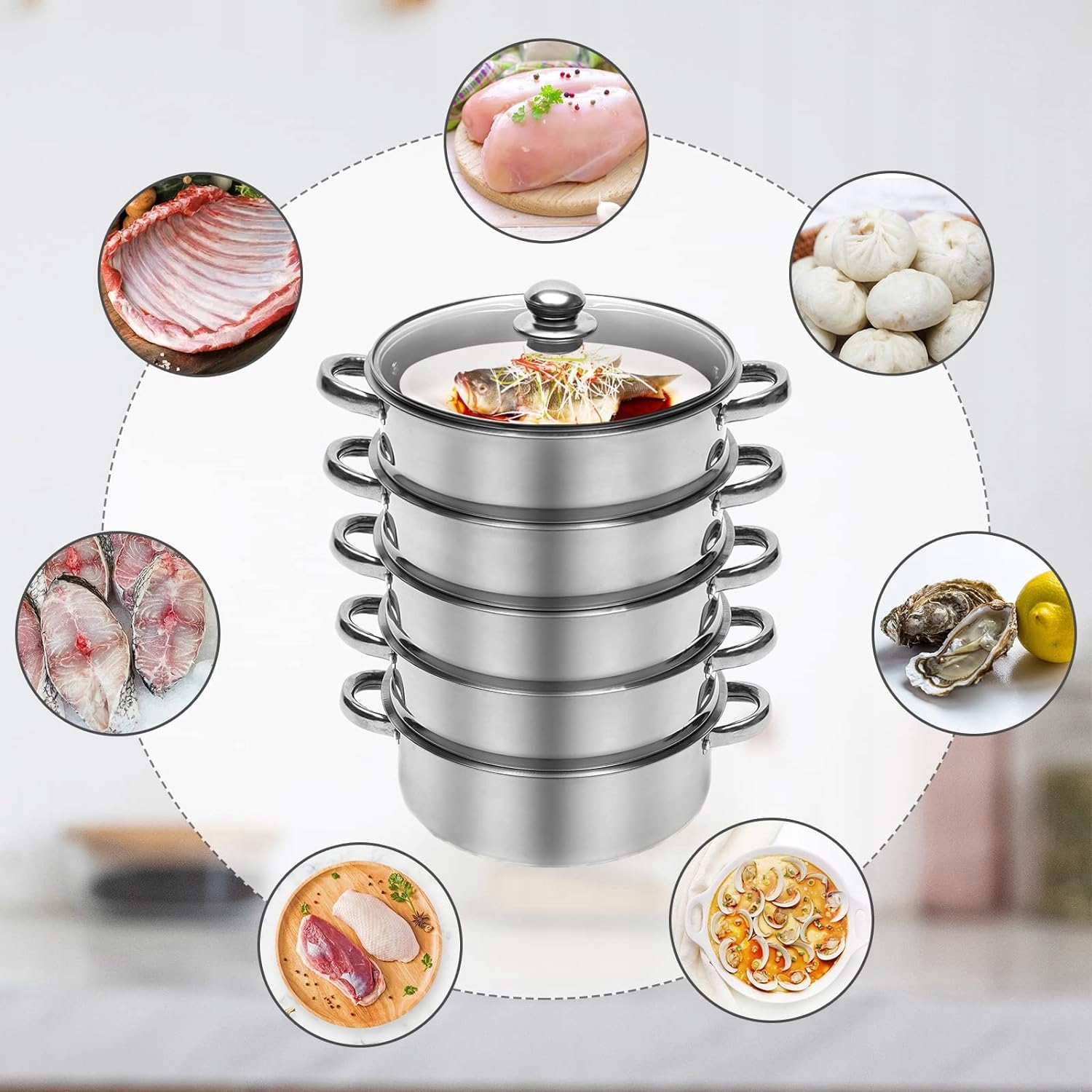 🧀🧀 [довге життя] Весь пароплав виготовлений з відшліфованої нержавіючої сталі, яка є міцною і не легко корозійна, тому він може працювати тривалий час. Він рівномірно розподіляє тепло і прискорює приготування їжі. Композитне дно міцне, міцне і непросте в пункції.