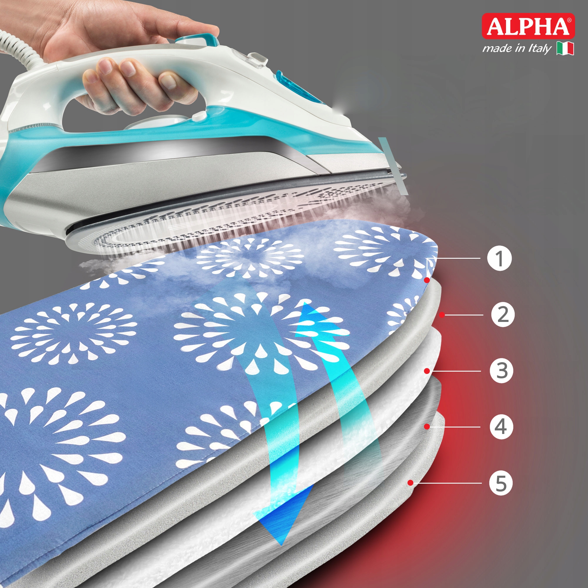 Ми представляємо вам свій інноваційний, 5-шаровий перший бавовняний шар обкладинки, а потім конденсується в піні та фетру. Алюмінієвий шар діє як бар'єр для води, нагрівання та викликає випаровування молекул води в нижніх шарах. Завдяки цьому ви прасуєте матеріал як зверху, так і з нижньої пари, що забезпечує чудові прасувальні ефекти.