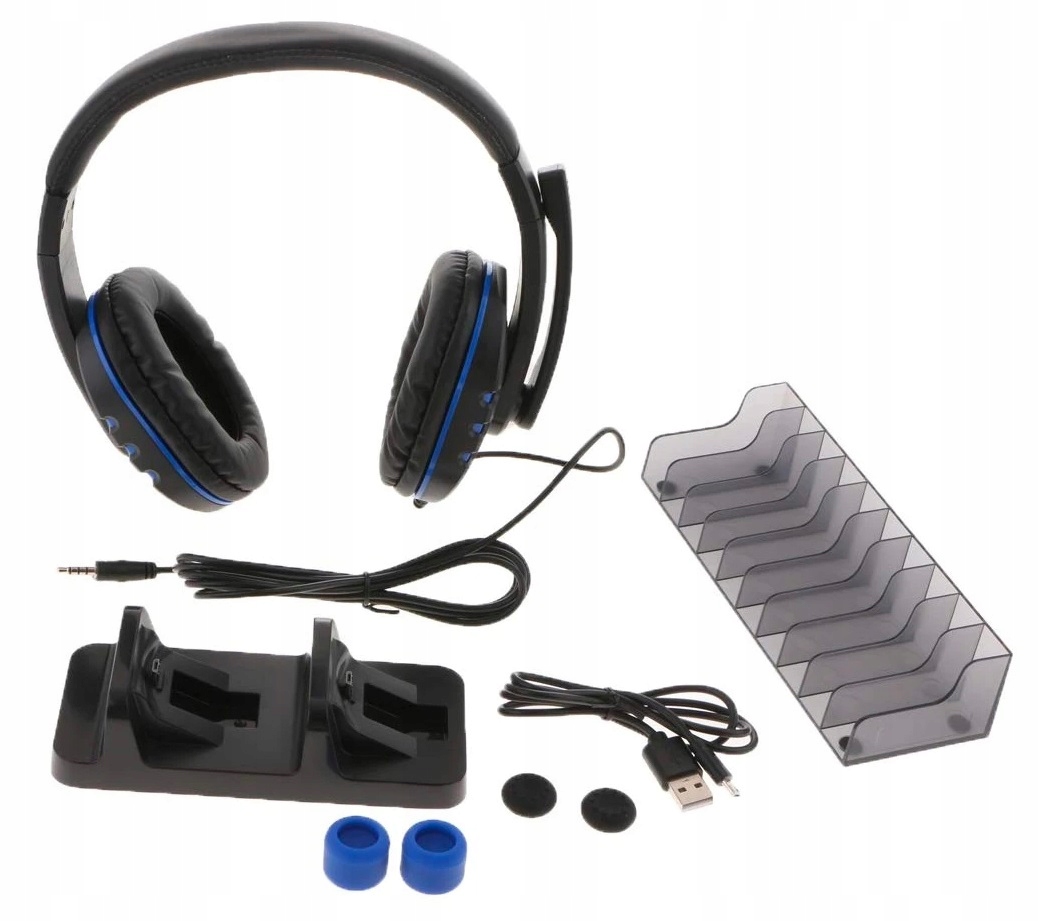 Геймерські навушники з мікрофоном, станція для 2 пэдов, підставка на 10 ігор, 4x силіконові грибоподібні накладки, кабель для зарядки.
